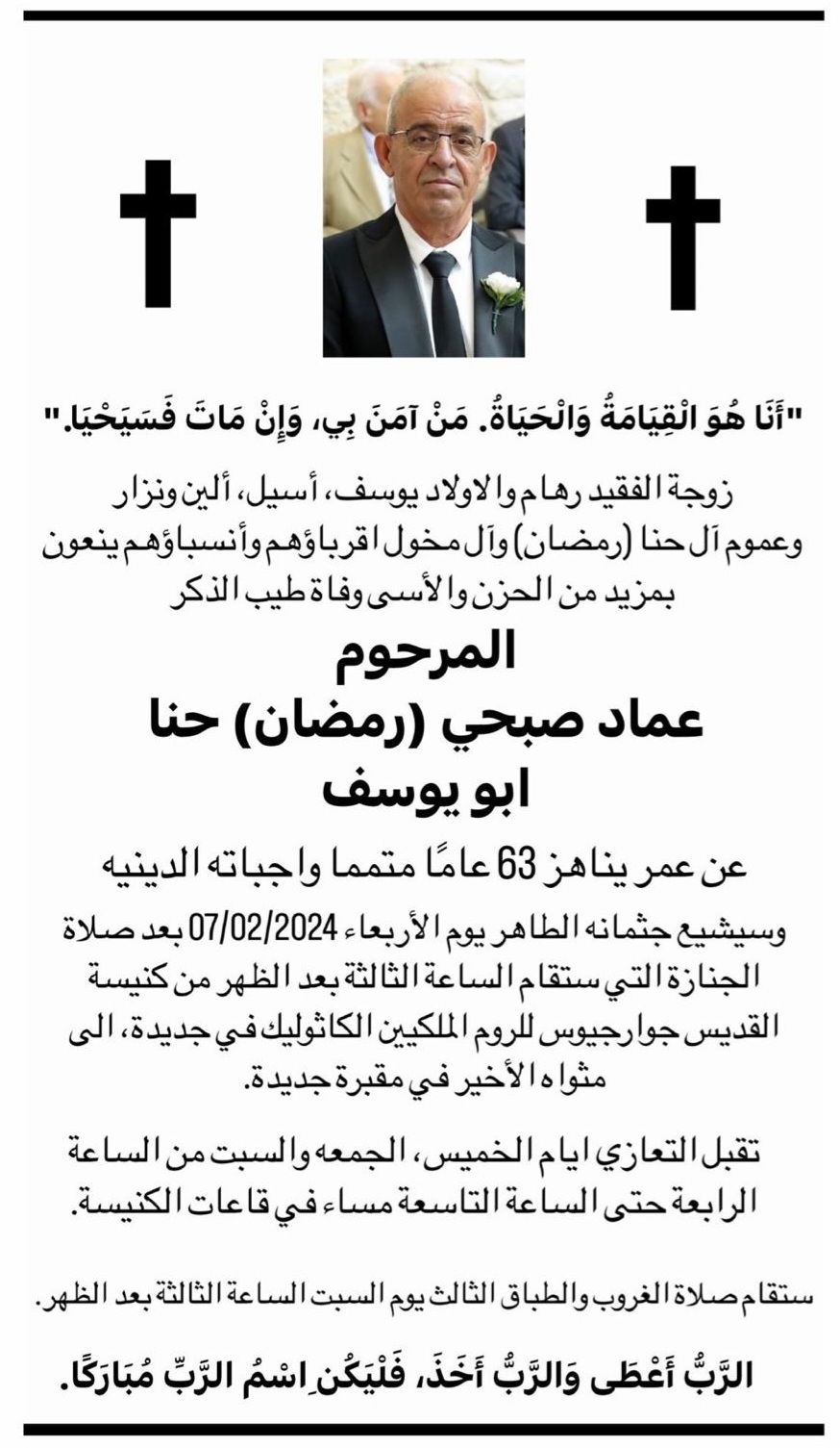 عماد صبحي “رمضان” حنا (ابو يوسف) في ذمة الله